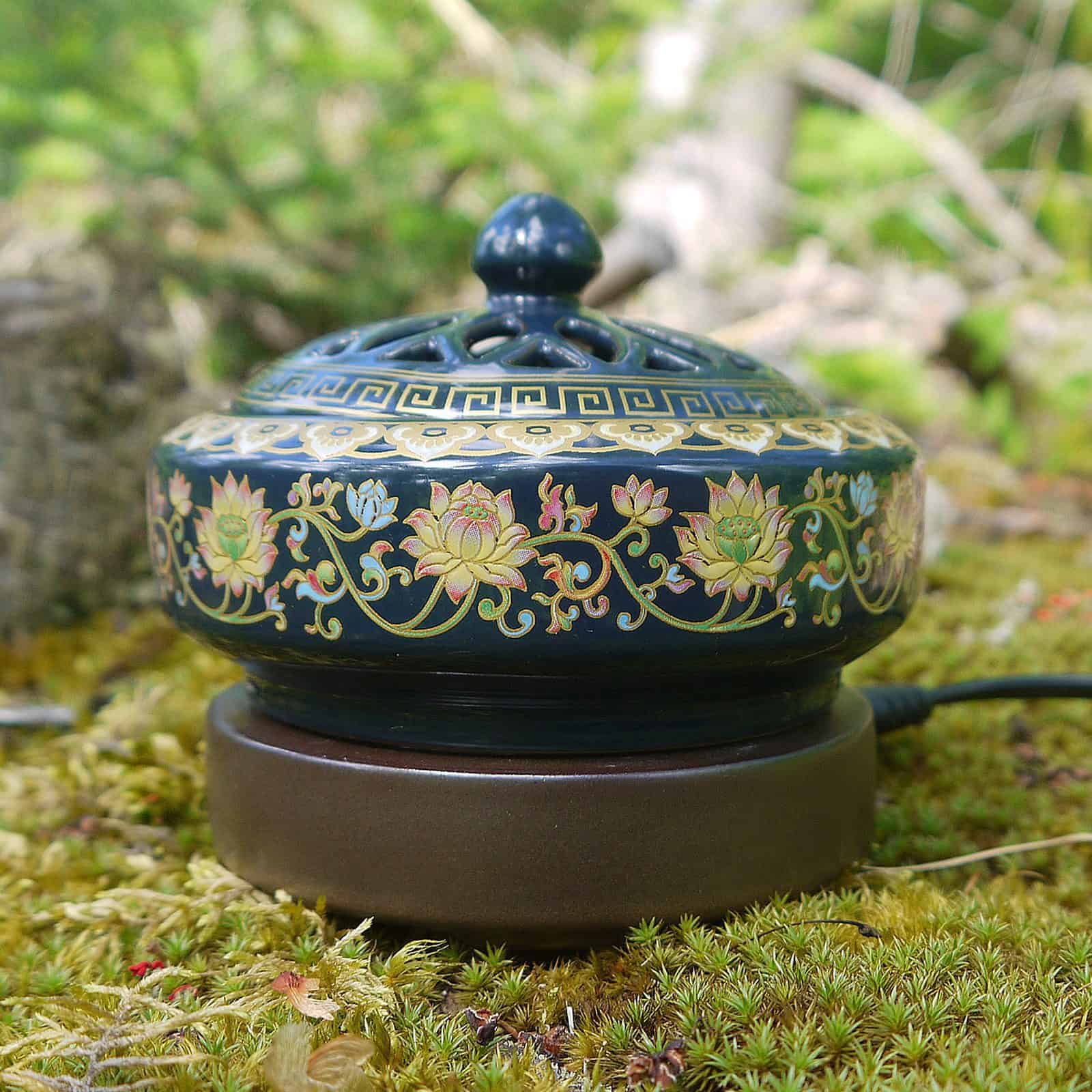 Le lotus apparaît trois fois, retraçant le cycle de vie complet du développement spirituel : sous forme de racines dans la boue (suggérées par la base brune), de fleurs interconnectées dans le royaume cosmique (le cercle de lotus), et de bourgeon singulier s’élevant vers l’espace (le fleuron au sommet). Lorsque les arômes d’encens s’élèvent dans ce récipient sacré, ils constituent une métaphore du voyage spirituel représenté sur le brûleur lui-même, qui commence dans la matière terrestre, se transforme sous l’effet de la chaleur, s’élève sous forme de parfum dans le royaume cosmique et se dissout dans l’espace, reflétant le voyage de l’âme de l’existence terrestre à l’illumination.