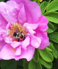 J’ai une haie de soixante-dix rosiers que j’ai fait pousser à partir de graines et que j’ai cultivés pendant trois ans jusqu’à ce qu’ils fleurissent. Roses et moi nous connaissons donc intimement. Chaque été, je passe des heures à récolter des pétales de roses au milieu du bourdonnement des abeilles. L’air chaud du petit matin est saturé de l’arôme puissant, chaud et mielleux de Rosa rugosa. L’odeur des roses dans l’air, combinée au bourdonnement hypnotique des abeilles, ouvre la voie à une expérience transcendante, proche de la transe, lors de la récolte. Le temps ralentit et j’aime observer la riche communauté de roses dont je fais partie ; les nombreuses sortes d’abeilles, les araignées roses et camouflées qui attendent, les ronces des rosiers qui se penchent pour agrandir la colonie, les nids d’oiseaux…